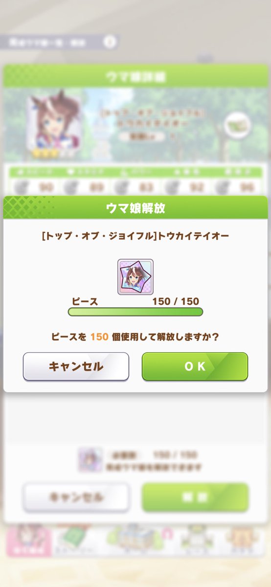 私はあともう少しで交換できるテイオーちゃんが24個!そして会長が残り57個!現在会長のピースを集め中。楽しみだ…