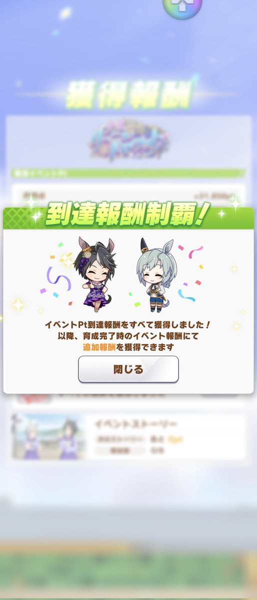 ホントイベント楽になったなぁ「今宵、リーニュ・ドロワットで」を昨日無事100万イベントpt達成。今、108万ptくらい。今回良かったわぁ。 #ウマ娘今回のイベントも100万到達&無事完走です~。なんか最近ウマ娘が楽しい…。いや以前から楽しかったけど、クライマックス編になってから以前より楽しく感じてる、私?#ウマ娘 pic.twitter.com/O5RvT7P948