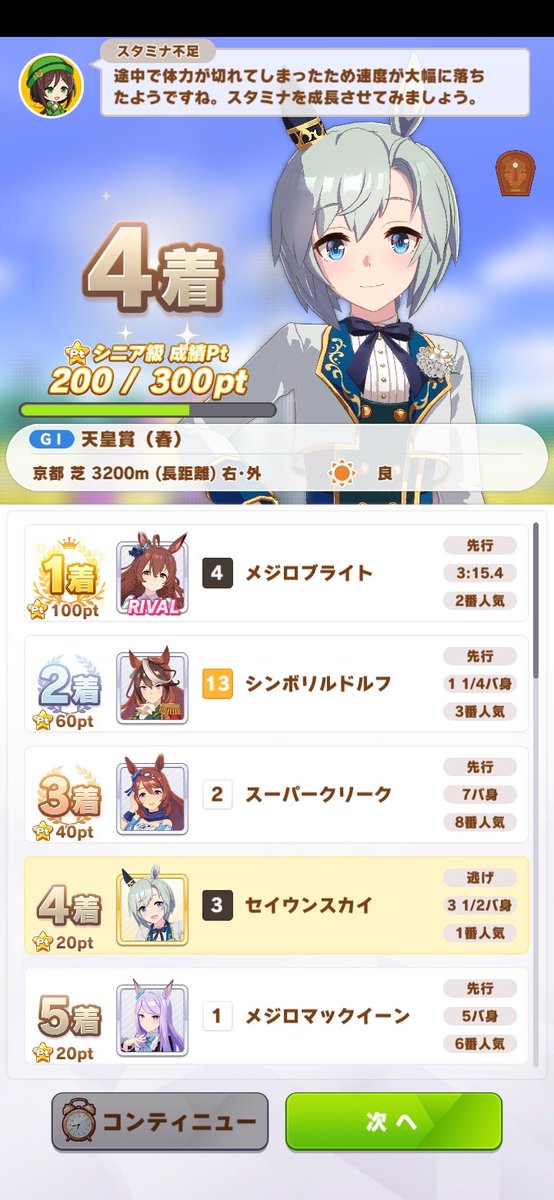 とはいえスキル良好だし賢さ不安すぎるけどこれ以上上がる気がしないからこれだそうかな…競り負けそう pic.twitter.com/XDMhubKhDv天皇賞(春)はやっぱりスタミナが一番重要やな。いつもならスタミナはエンジ全開で上げている人が慣れないスピ賢さ育成して天皇賞(春)に出るとこうなる pic.twitter.com/qMDflYQP7S