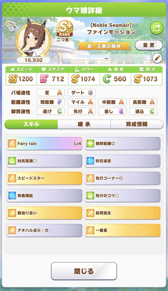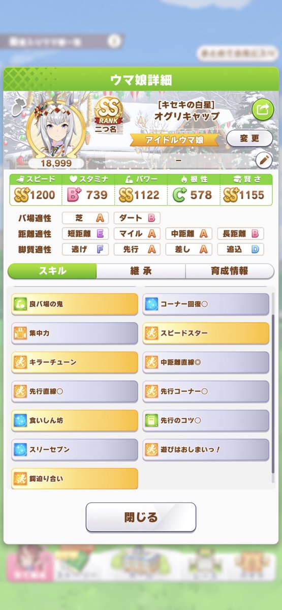 久々に満足いく育成が出来たわ。賢さとパワーが高いからそうそう中盤置いていかれはしないだろうけどもし終盤落ちても起死回生→鍔迫り合いで即復帰だイヤッホウ pic.twitter.com/N0705XTlCO@marororon7 とりあえず5回ぐらい回しましたが全部栗オグリに負けてますね〜
