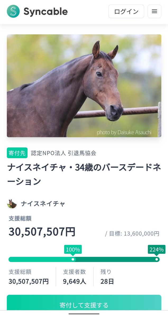 syncable.biz/campaign/2506 pic.twitter.com/tc8RKaugRvナイスネイチャのバースデードネーション、左が4月17日8時28分時点、右が4月18日0時28分時点なんだけど、計算すると1時間あたり約41万円増えてる。もしこのままのペースを維持したら、締め切りまでに2億7700万円以上の寄付が集まることに。すごい。 pic.twitter.com/JqXDWt0cVwナイスネイチャのバースデードネーション