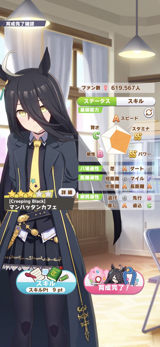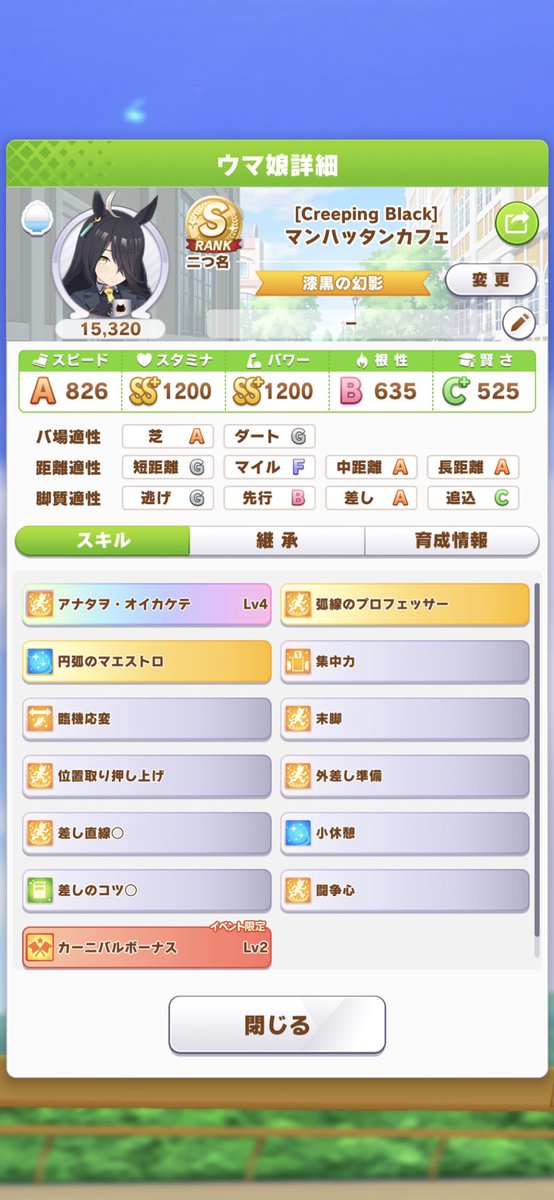 ちなみにカフェはメイクラ育成が死ぬほど難しいカフェ育成してるけど、こいつのスタミナ30補正って、結構つよつよなのでは…?マンハッタンカフェ育成難しい。スタ30%と適正距離が足を引っ張ってる。