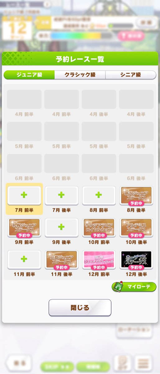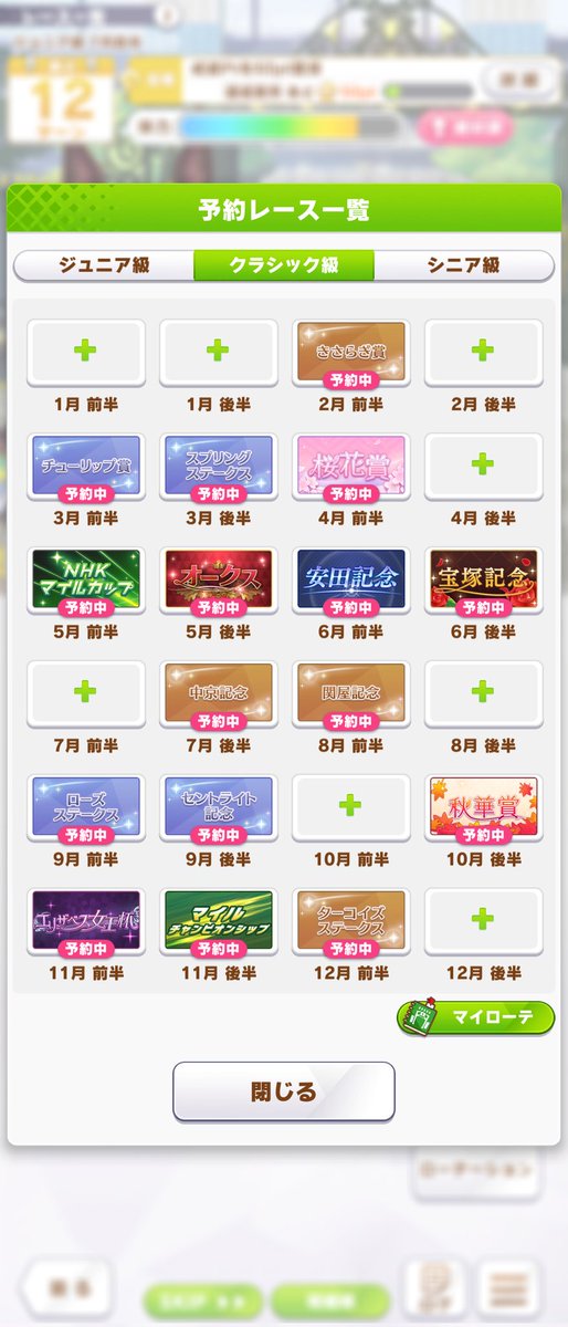私は普段35戦ローテでやっていますが、今ちょっと42戦ローテに挑戦中。だけど連闘はせいぜい最大5連戦ぐらいですね!クラシックとシニアの最後で2回ぐらいやっています。3連戦は5連戦を除いて3回
