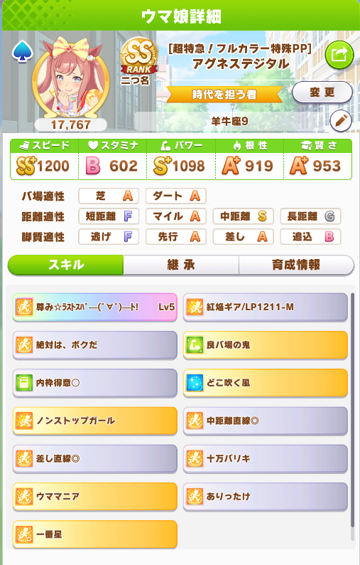 中盤スキル盛りだくさんコーナー直線全部◎春ウマ◎良鬼十万バリキ尻尾上がり垂れウマアオハル速ウママニア芝と中距離Sタウラス杯用アグネスデジタルできましたあ!!!個人的にスキルが理論値に近いレベルあるのでこれで完成で!絶対差しのなかで一番前を取って彼方ギアで逃げ捉えるぞー!!!!! pic.twitter.com/3Ppl9Ewze6スタミナ不安の差し根性3で挑むタウラス杯。