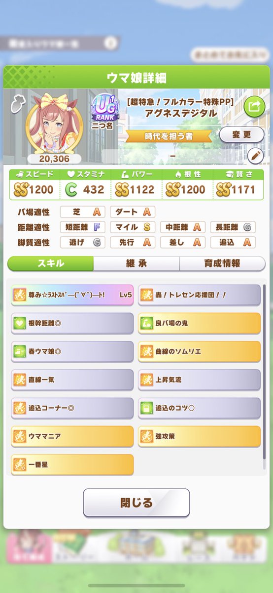 …初UGに興奮してスタミナ見てなかったのはご愛嬌(´・ω・`) pic.twitter.com/gQ3sUsM6eGジェミニ杯のコース補正はスタミナ、根性が高い程スピード値にボーナス付くから皆根性育成しような