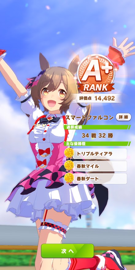 ジェミニ杯ファル子強い???ジェミニ杯オープン、ルムマ模擬。ファル子、追込白キングを軸に5戦全勝。ファル子2勝、白キング3勝。土曜夜はエンジョイ勢が多いということですかね。つまり、本番でも時間帯をメタればいい、と。(向上心のかけらもないわたし) #ウマ娘 pic.twitter.com/fCKZwBMvSIクライマックスでジェミニ杯オープン用のファル子を育成。マイルの逃げ。スピードイーターも拾えたし、緑スキルこみで根性700↑、賢さ700↑にも出来たし、まぁ、満足かな。え、マイルS? ファル子にそんなものは必要ないですよ?(真顔)#ウマ娘 pic.twitter.com/yOeFDkhnRi