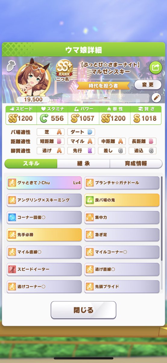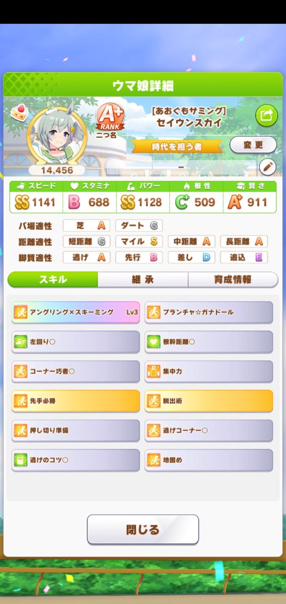 現状逃げウンスが1番勝率が良い。地固めはパワーファル子だとスタミナ上がり過ぎるんで根性バクシンで良いかな。