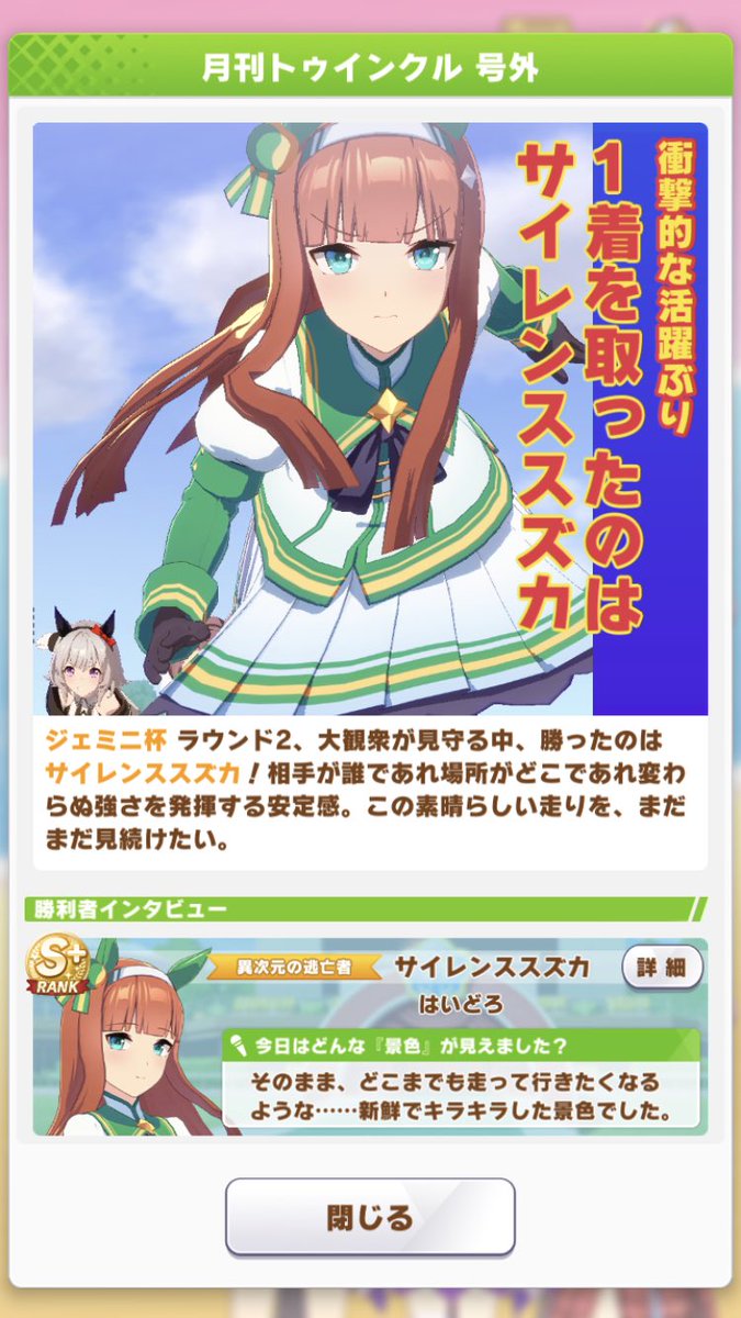 終盤までにスズカに追いつけなかったものの接続してソッコー捕まえて追い比べ発生し、結局アンスキ出たのと変わらん加速してゴール
