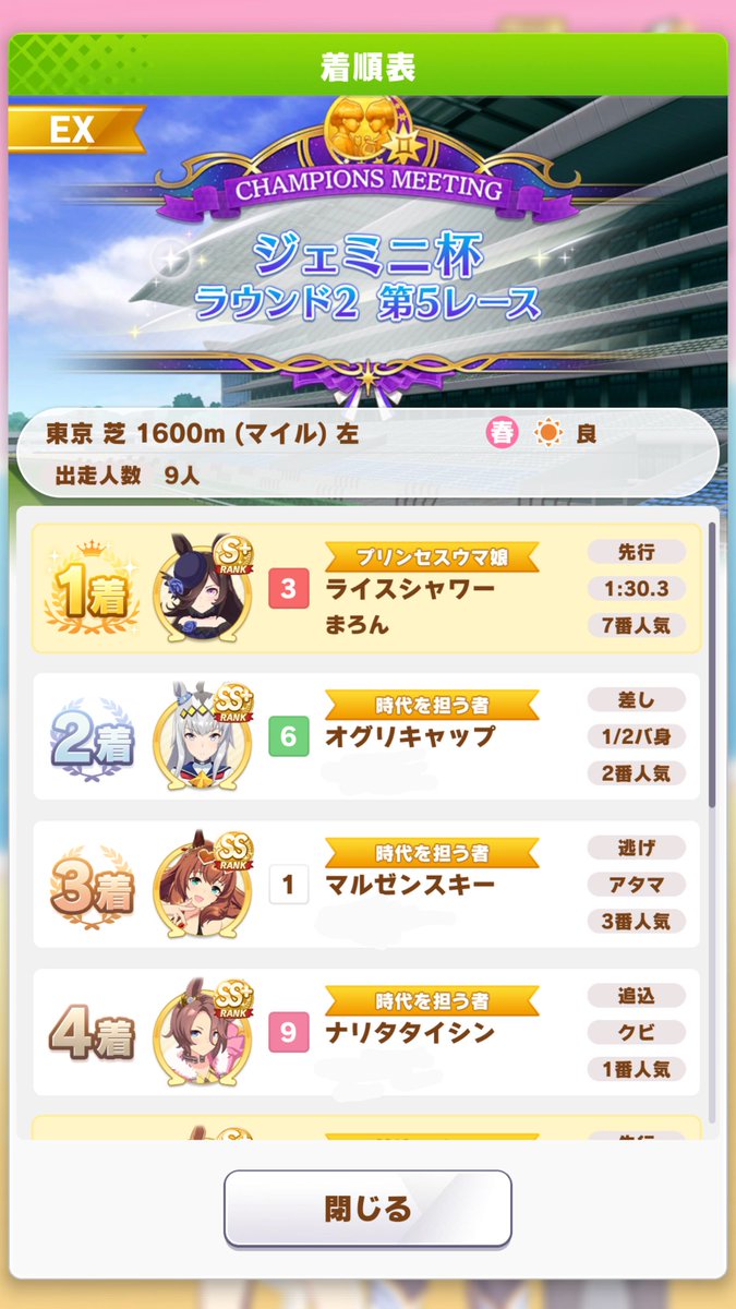 生徒会とかシンデレラグレイとか推しがジェミニ杯勝ったのでとりあえず一安心ジェミニ杯も相変わらず推しで挑んでるけど、マイル適正ないフラッシュ、固有が有効でないダイヤ、デバフ?ネイチャで勝てると脳汁ヤバい