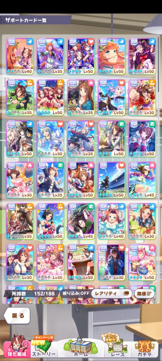 SRのシンコウウィンディを完凸してから、SSの育成が増えたな。やっぱサポカ選びは大事だ