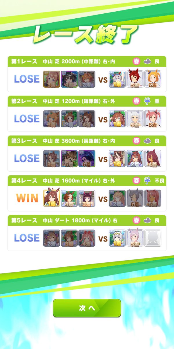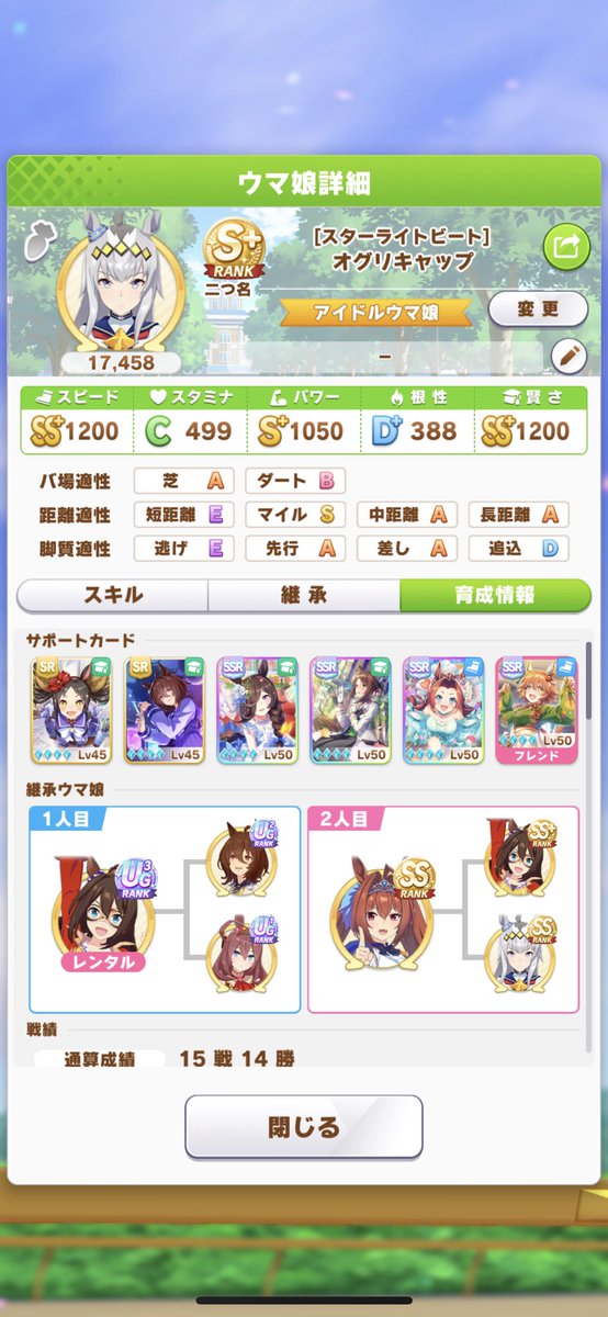 ターフクイーンズ597: 名無しのトレーナー 2022/06/27(月) 16:39:46.60 ID:UBtKscvF0アオハルだと根性盛れないからな613: 名無しのトレーナー 2022/06/27(月) 16:43:26.03 ID:4FY7IG1Xdターフクイーンズはオグタマ入りが完成系よね622: 名無しのトレーナー 2022/06/27(月) 16:44:22.32 ID:eRB2mLLy0ターフクイーンズも今ならタイキ入れれば余裕かなと思ってやったら2回やって3勝2敗と2勝3敗でもう2度と挑まないと誓った?625: 名無しのトレーナー 2022/06/27(月) 16:44:58.03 ID:LQTg005Vd>>622