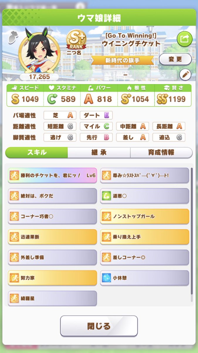 チケゾー育成で多分初めて初期所有の努力家、迅速果断覚えさせなかったけどレース展開に問題無し。