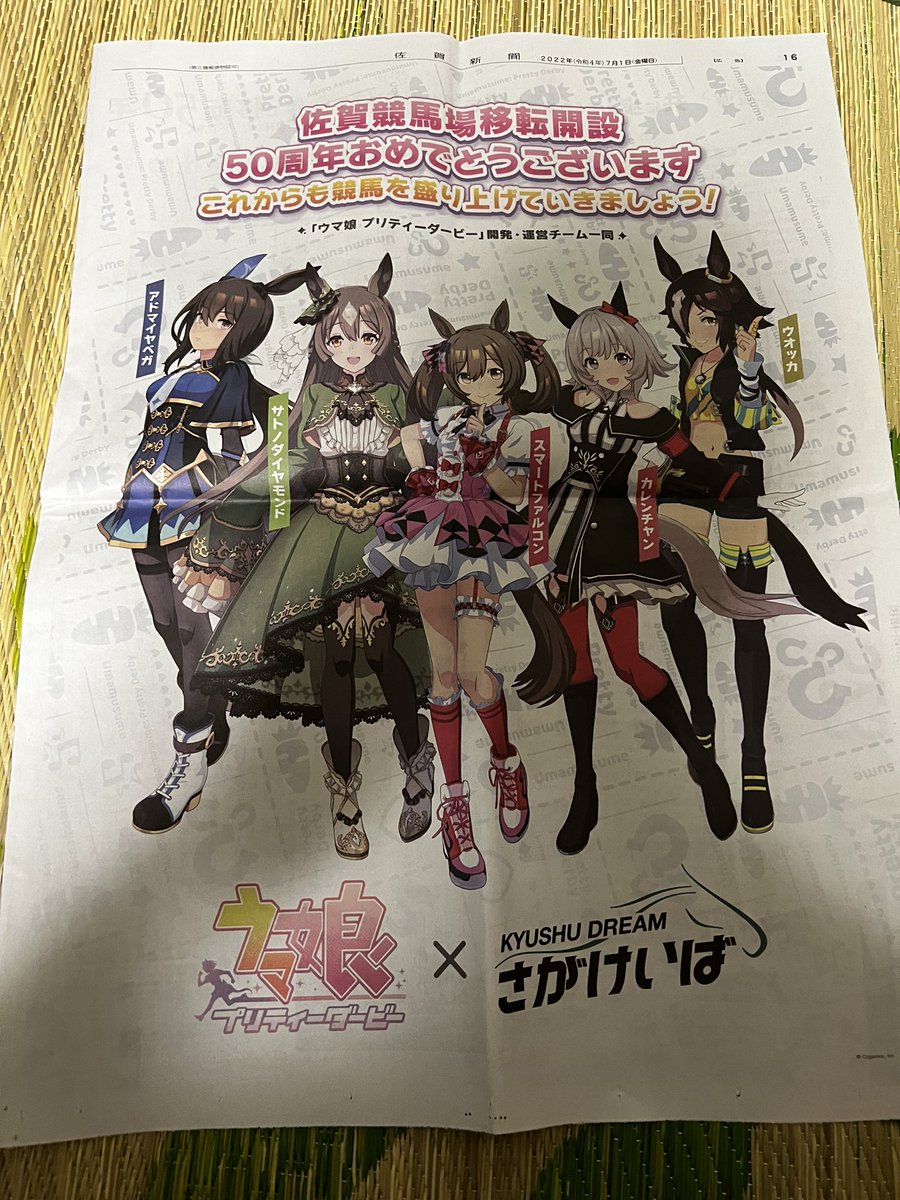 今日の佐賀新聞に、佐賀競馬場移転開設50周年の記事+ウマ娘コラボ、ってのがあるようで買いに行ったら売り切れでした。図書館で読むことになりそうです。