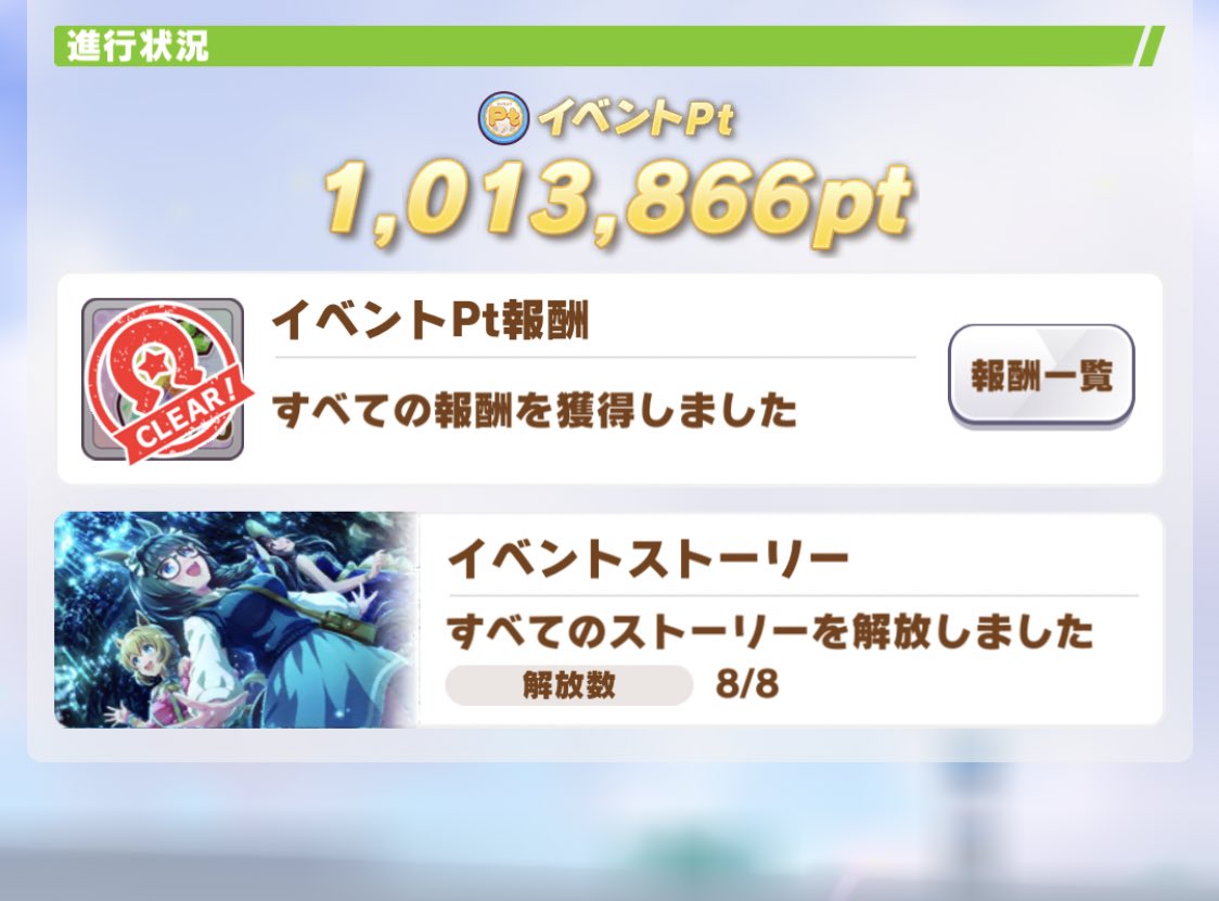 #ウマ娘 ストーリーイベント残り5日から頑張って、イベントミッション全部クリアして称号ゲット(:.;゜;Д;゜;.:)ハァハァ今回はサポカ完凸とイベント称号取れればいいやーと思っていたのですが…