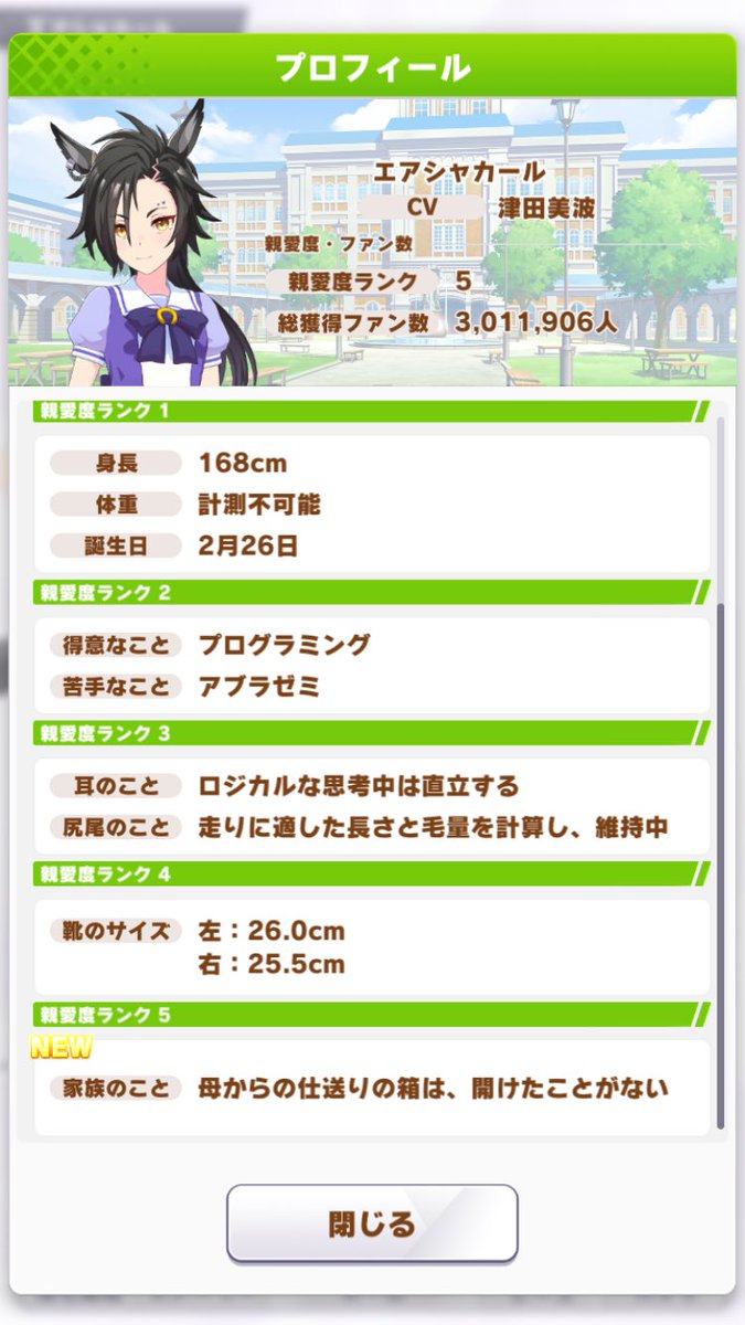 シャカールと母親の関係が…これは…シャカールの母親のイベント1回目の育成じゃ出なかったからびっくりした これかあ…シャカール、母親とうまくいってないんやな描写とかを見るに、シャカールの父親は割と仕事人間な気もしてくる母親は身近にいたからどんな人が掘り下げがあったけど、父の情報が数学者だけってのは知ってることがそれだけって事の暗喩なのかな