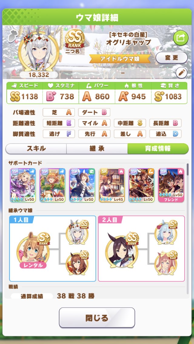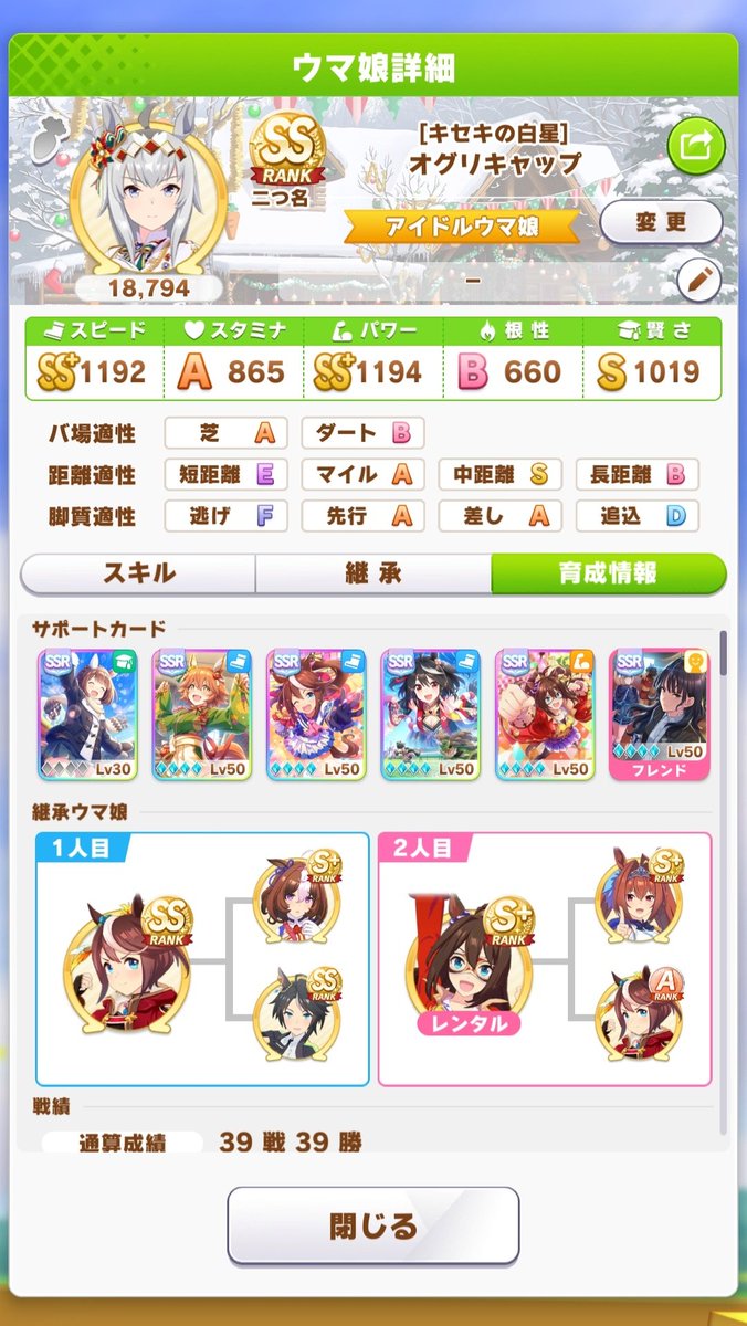 なるほど。賢さ因子があればユキノだけでここまで盛れるなら根性育成もありだな(●︎´▽︎`●︎)