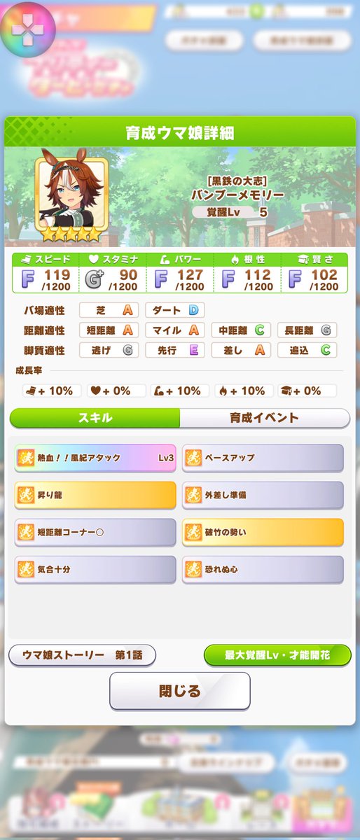 でも明らかに差し用の固有っぽいし…バンブーメモリー、短距離マイルの後方脚質における救世主になりうる性能かもしれんですわねバンブーメモリーは衣装がいい感じなんだが、性能的にちと弱いな。追い抜きで加速するために加速スキルが必要なんだよ!そんで加速したらもう加速はいらないんで・・