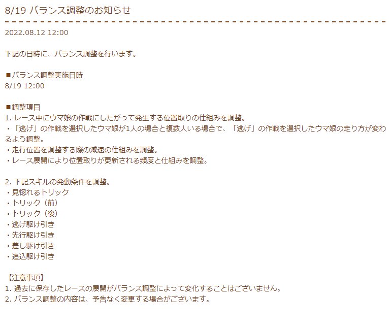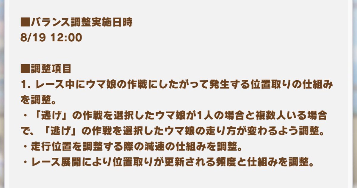 逃げのバランス調整が単逃げ強化なら歓迎。逃げ1が許容される方が脚質編成の自由度が上がる気がするので。単逃げ強化されんのは地味にえらい、逃2出ししなくて済むのは単純に編成の幅が広がる単逃げ弱い問題と逆噴射問題が直るのだろうか。また編成やスキル構成ががらっと変わりそうな予感単逃げの選択肢が出てくるなら、片方が必ず死ぬ逃げ複数にしなくても良くなる